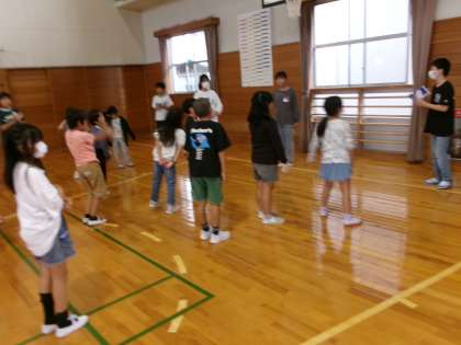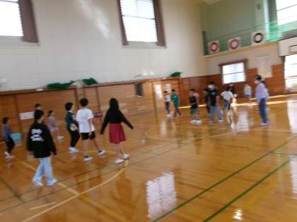 後期第1回ファミリーあそびをしました。新しいファミリー班では初めてのあそびです。体育館でドッジボールをしてあそびました。
