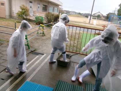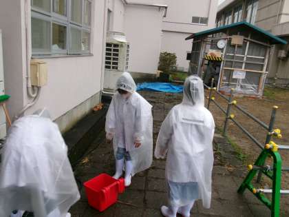 牛小屋当番の子供たちは、合羽を着ながら、ななこのお世話をがんばっていました。