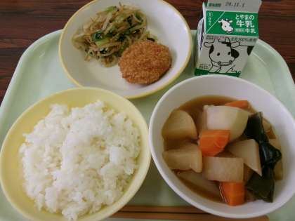 今日の献立は、ごはん、牛乳、メンチカツ、ごまびたし、おでんです。