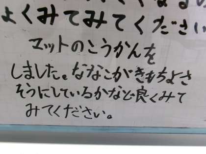 ベストが着られなくなるほど大きくなるのをよく見てほしい、マットを交換したので気持ちよさそうにしているかなどをよく見てほしい、と書かれてあります。