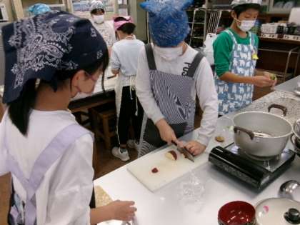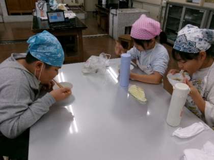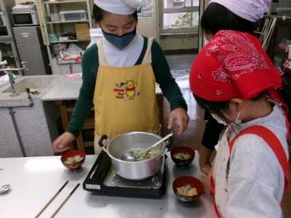 家庭科では、「食べて元気 ご飯とみそ汁!」の学習をしています。今日は、みそ汁を作りました。班ごとに具材を考え、煮干しから出汁をとりました。煮干しから出汁をとったみそ汁は初めてだったようですが、おいしかったようです。また、具材の切り方や硬さもよかったようで、どの班も嬉しそうでした。ぜひ、家でも作ってみてほしいです。