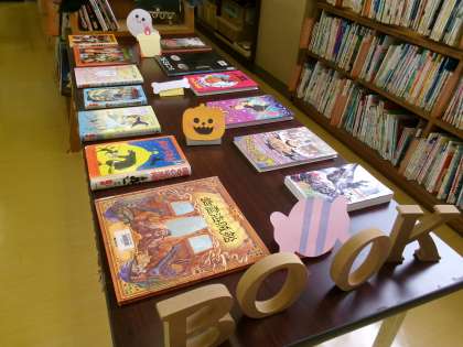 明日のハロウィンに合わせた本コーナーが特設されています。