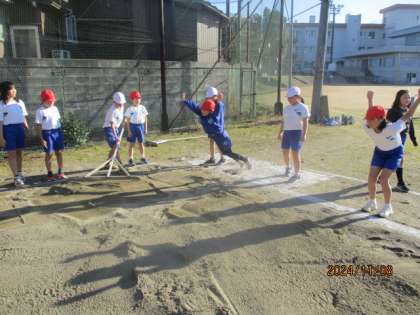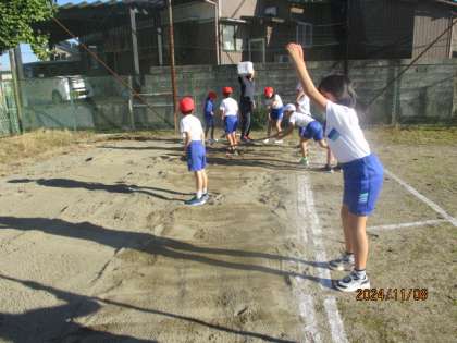 走り幅跳びの学習が始まりました。今日は、跳躍につながる動きのドリルをしたり、立ち幅跳びで跳ぶ感覚を養ったりしました。次回は助走をつけて跳んでみます。楽しみですね。