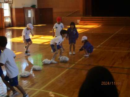 投げる、蹴るの動きを用いた遊びをしています。「ばくだんゲーム」では、自分の陣地に来た爆弾に見立てた新聞を包んだ袋を相手の陣地に投げたり蹴ったりしていました。「蹴った方が遠くまで飛んだ」「狙いやすいのは投げる方かな」など、考えながら取り組んでいました。