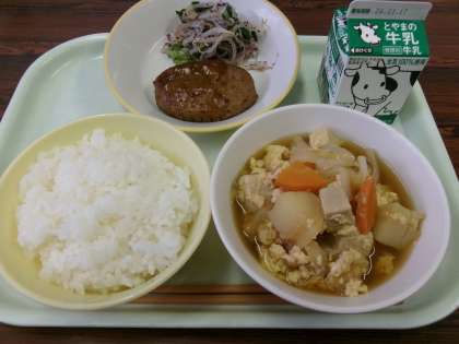 今日の献立は、ごはん、牛乳、照り焼きハンバーグ、ゆかり和え、卵とじです。