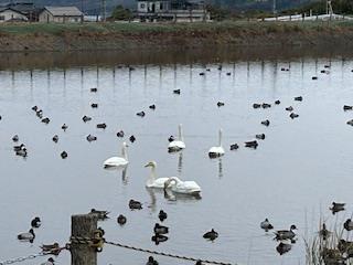 今朝の田尻池は、肌寒く小雨が時折降っています。白鳥の飛来数は9羽でした。昨日は向こう岸付近にいましたが、今日は、駐車場近くまで来ていました。