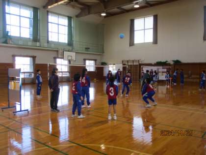 ソフトバレーボールのゲーム形式で練習をしています。たくさんつなげるかな。