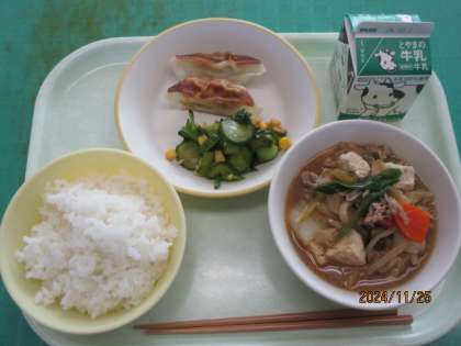 今日の献立は、ごはん、牛乳、焼き餃子、コーン和え、韓国風すきやきです。