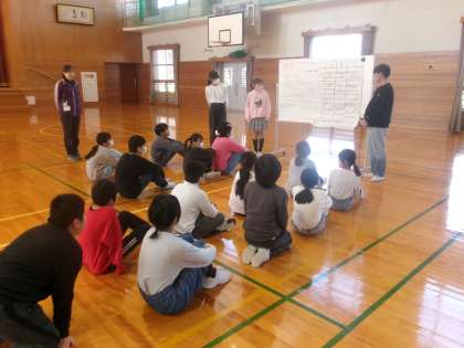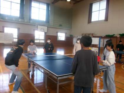 6年生の国語「みんなで楽しく過ごすために」で、他学年と仲を深めようとあそびを考えました。今日は5年生との交流する時間です。考えた遊びは「卓球」です。5・6年生がペアになり行いました。得点が入ったときはいっしょに喜び合う姿も見られました。