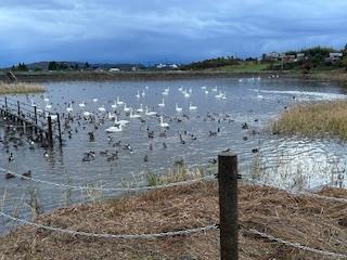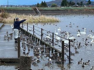 今朝の田尻池は曇っています。飛来数は昨日より増えて50羽くらいでした。白鳥愛護会の方がえさを与え始めると、すぐによってきます。カモは少なめでした。