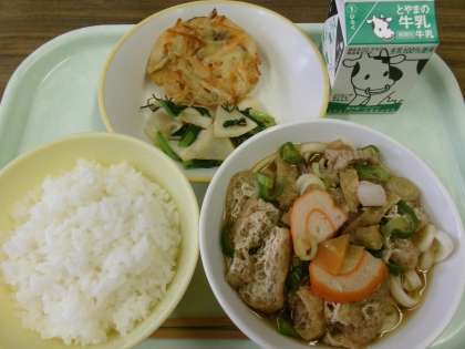 今日の献立は、ごはん、牛乳、野菜かき揚げうどん、やちゃらです。
