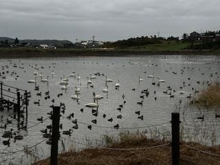 今朝の田尻池は雨が降っています。気温は6度でした。飛来数は昨日と同じくらいで50羽ほどでした。