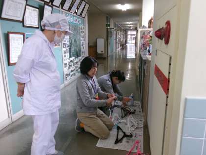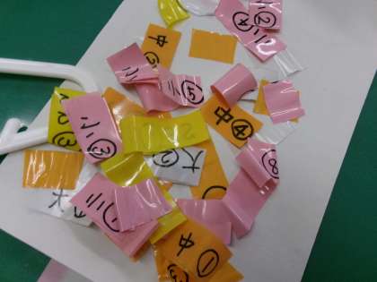子供たちが分かりやすいように、サイズ毎にシールの色を変え、さらにハンガーと白衣が対応するように番号が書かれていました。