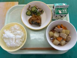 今日の献立は、ごはん、牛乳、揚げ魚のみぞれだれ、ゆかり和え、豚肉とじゃがいもの南蛮煮です。