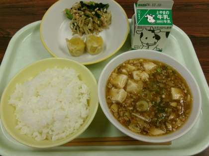 今日の献立は、ごはん、牛乳、にんじんシューマイ、小松菜の大豆そぼろ和え、マーボー豆腐です。