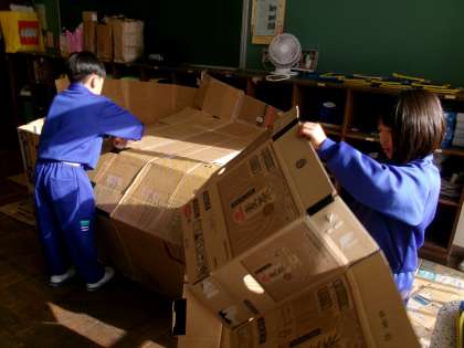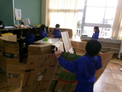 教室の広いスペースを使って、ひみつきちバスをつくっています。