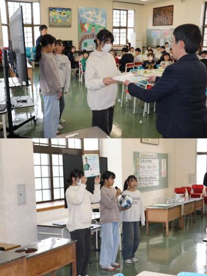 明治安田「未来世代応援アクションwithカズ」の一環としてサッカー元日本代表の三浦知良選手より寄贈されたサッカーボールが、校長先生から健康委員会代表の子供たちに手渡されました。代表の子供たちからは、このボールを使って楽しくサッカーをしましょうという呼びかけとお礼の言葉がありました。