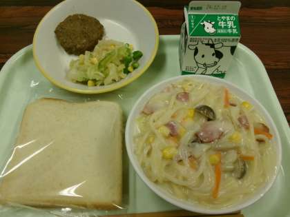 今日の献立は、減量食パン、牛乳、鷄つくね、切干大根のサラダ、クリームスパゲッティです。