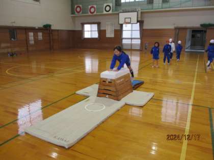 跳び箱を使った運動遊びをしています。跳び箱に乗ったり飛び降りたり。踏み切り板を使って飛び越す動きに挑戦する子供もたくさんいます。準備、片付けも手際よく協力して行えるようになりましたね。