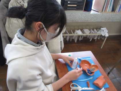 紙粘土で作った作品に、水のりに色の粉をまぜた物を流して流れを作りました。