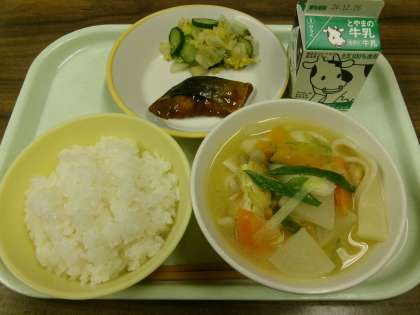 今日の献立は、ごはん、牛乳、鰺のみりん焼き、柚子あえ、ほうとう鍋です。