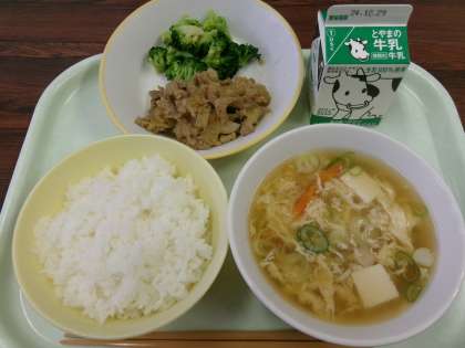 今学期最後の献立は、ごはん、牛乳、豚肉のジャンロー、ゆでブロッコリー、かきたま汁です。