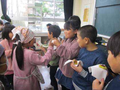 ななこのお世話をリードしてくれた3年生にありがとうの気持ちをこめて、スイートポテトをおすそわけしました。