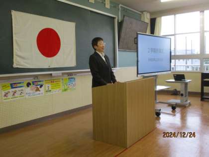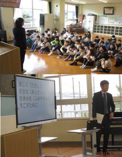 子供たちは、終業式の後に、冬休みの安全で健康な過ごし方について話を聞きました。