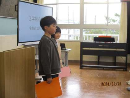 終業式では、校長先生に「2学期の中で一番心に残ったことは何ですか」と聞かれた子供たちからは「ななこ」という言葉がすぐに出てきました。最近のななこの動画を見た後、新しい場所でがんばっているななこのように、新しい年、進級、進学に向けて、自分を高めることをがんばる冬休みにしましょうとお話がありました。