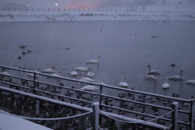 今日の田尻池は、雪がしんしんと降っていました。冬休み中もコンスタントに90羽ほどの白鳥が飛来していました。多いときには100羽を超える日もあったようです。