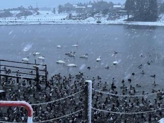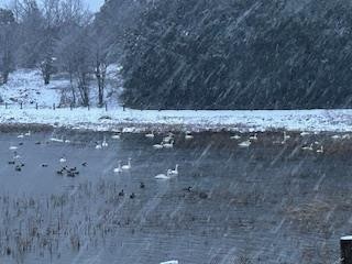 今朝の田尻池も雪が降っています。気温は0度です。飛来数は80羽くらいでした。
