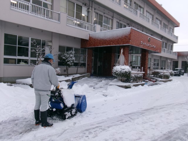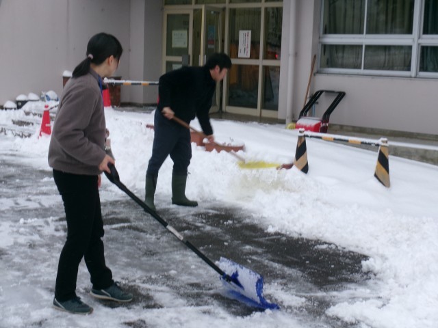用務員さん、教員が、玄関前や交通公園周りを除雪します。