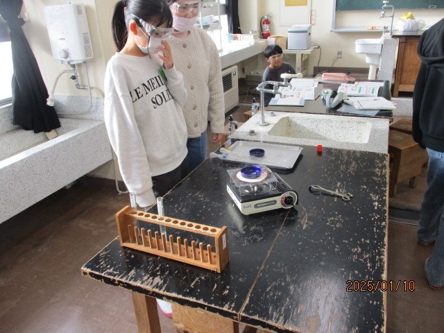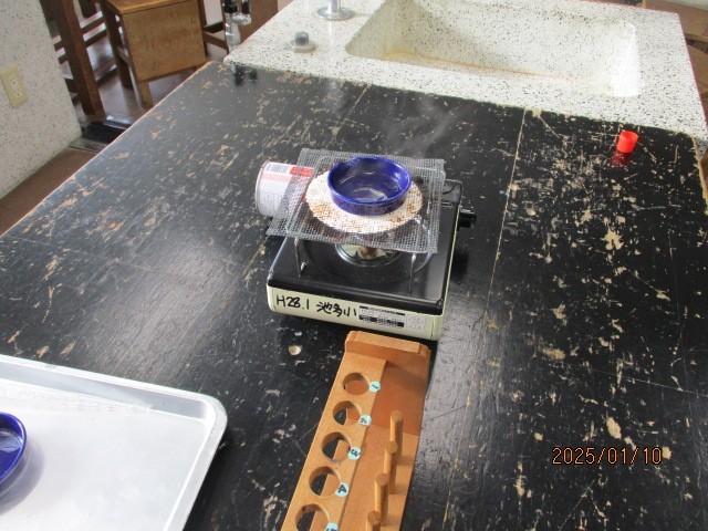 塩酸で鉄やアルミニウムを溶かした溶液を蒸発させる実験を行っていました。蒸発させて出てきた物質は元の鉄やアルミニウムなのでしょうか。色や様子から考察を重ねていました。