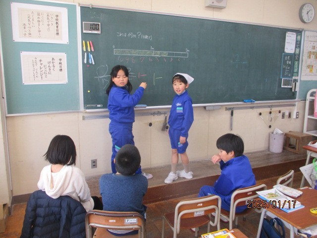 1より大きい分数の表し方を考えました。先生からの問題の答えを5人で相談しました。「分母は変わらないんじゃないの?」「10分の7だと1mより短いよ」等、既習事項を用いて鋭いつぶやきがたくさん生まれました。みんなで考えるって楽しいですね。