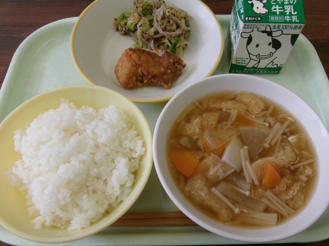今日の献立は、ごはん、牛乳、豚肉のかおり揚げ、梅肉和え、のっぺい汁です。