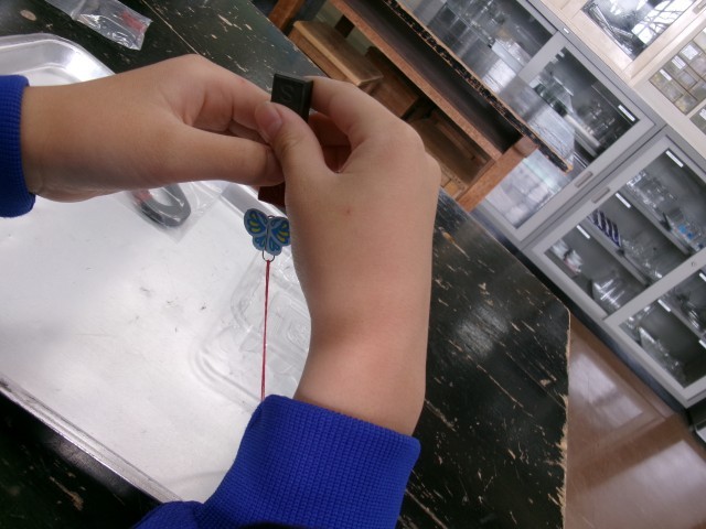 磁石の力でゼムクリップの付いた「蝶」を飛ばします。