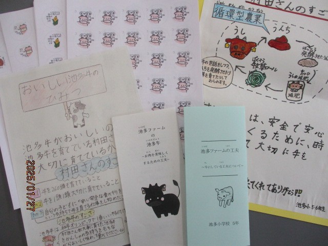 総合的な学習の時間「池多牛から学ぼう」で、子供たちが感じた池多ファームさんの取組のステキさをポスターやパンフレットにして表現したものをメツゲライ・イケダさんに置いてもらうことになりました。子供の思いがお店に来られるお客さんに伝わるとうれしく思います。メツゲライ・イケダさん、ご協力ありがとうございます。