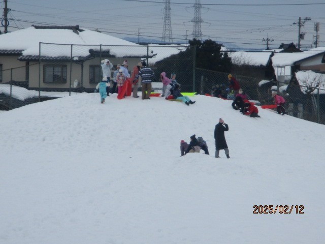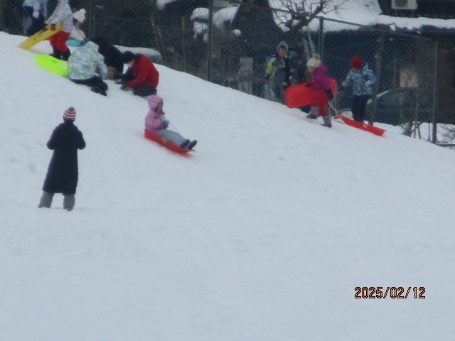 たくさん積もった雪山でそり遊びです。上級生がうまく滑るコツを教えてくれました。気温は低いですが温かい表情が溢れていました。