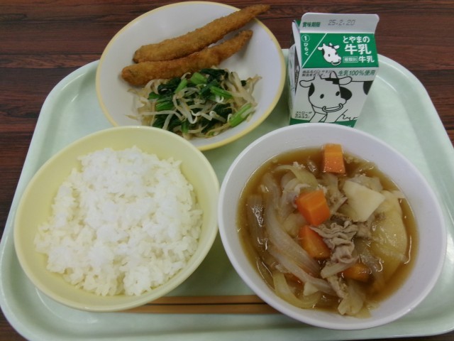 今日の献立は、ごはん、牛乳、ししゃもフライ、しょうがひたし、肉じゃがです。