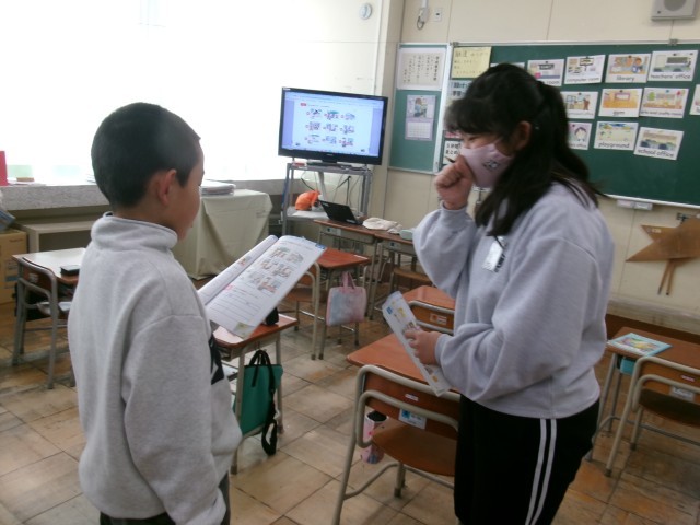 グラウンド、音楽室等、英語で答える子供たちです。