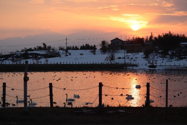 今朝の田尻池はオレンジ色の朝日が水面に映って綺麗でした。飛来数は少なく38羽でした。