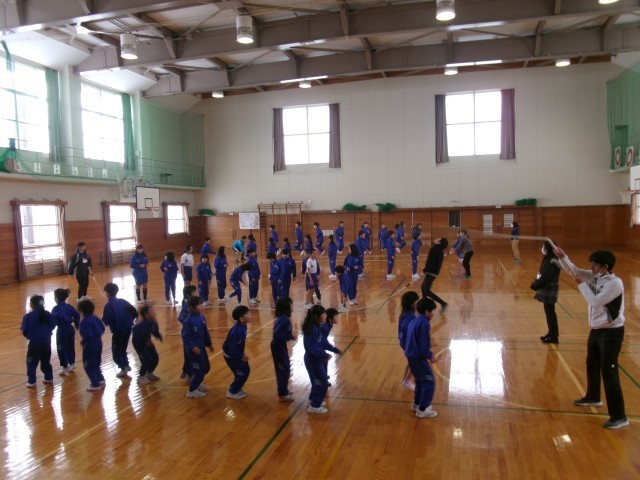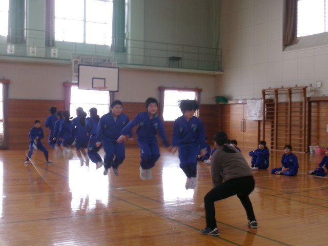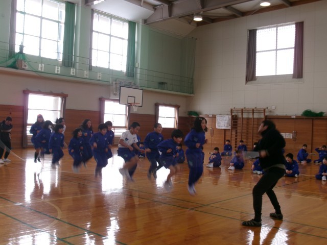 ファミリー班ごとに「短なわリレー」を行い、最後はエキシビジョンの「長なわ跳び」です。