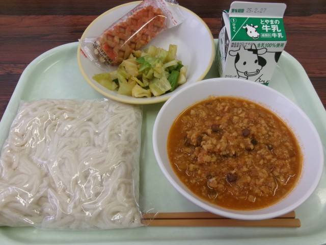 今日の献立は、ソフト麺のミートソースかけ、牛乳、チーズドッグ、アスパラサラダです。