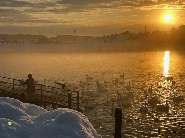 今朝の田尻池はもやがかかっているところに朝日が差し込んでとてもきれいでした。飛来数は土曜日45羽、日曜日39羽、月曜日38羽で、今日も40羽ほどでした。