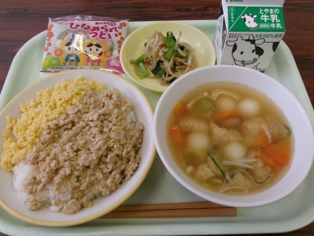 今日の献立は、二食丼、なばな浸し、白玉汁、ひなあられです。