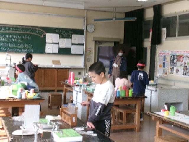 理科の時間につくったおもちゃを、まず1・2年生に楽しんでもらいます。