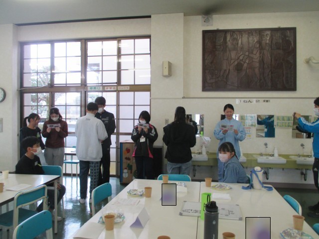 家庭科で調理実習を行い、みんなで協力して作ったサンドイッチを食べながら、楽しく会食をしました。