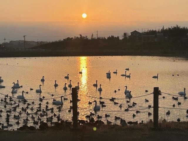 今朝の田尻池は晴れていて寒さはあまり感じませんでした。飛来数は昨日と同じで40羽くらいでした。