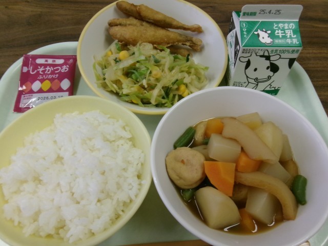 今日の献立は、牛乳、ごはん、わかさぎのフリッター、水菜のサラダ、関東だき、しそかつおふりかけです。