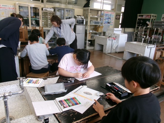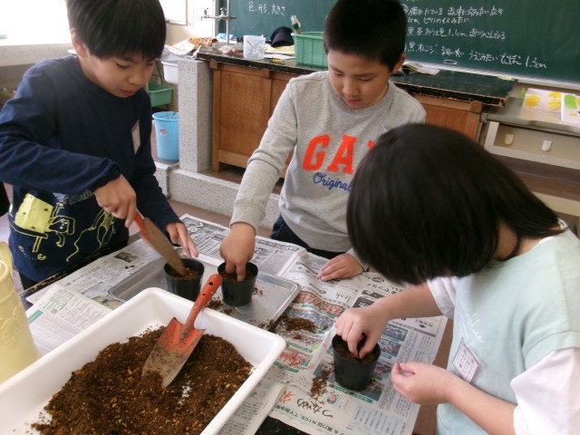 4年生は、ヘチマの種を観察したあと、種まきをしました。